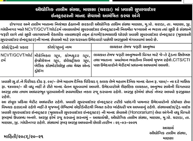ITI Mansa Pravasi Supervisor Instructor Posts 2021 - The ITI Mansa has released an employment notification inviting candidates to apply for the positions of below mentioned Pravasi Supervisor Instructor Posts.This is a great chance for interested candidates who are looking for ITI MANSA Jobs 2021. Before applying for the post, candidates should ensure that he/ she fulfills the eligibility criteria and other conditions mentioned in this advertisement. The last day for registration is March 26. Candidates are advised to carefully read the full advertisement for details of educational qualification and other eligibility criteria before submission of application.more detailed information regarding educational qualification,age limit,selection procedure,how to apply ,last date for ITI Mansa Supervisor Instructor Posts Vacancy 2021 are mentioned below.